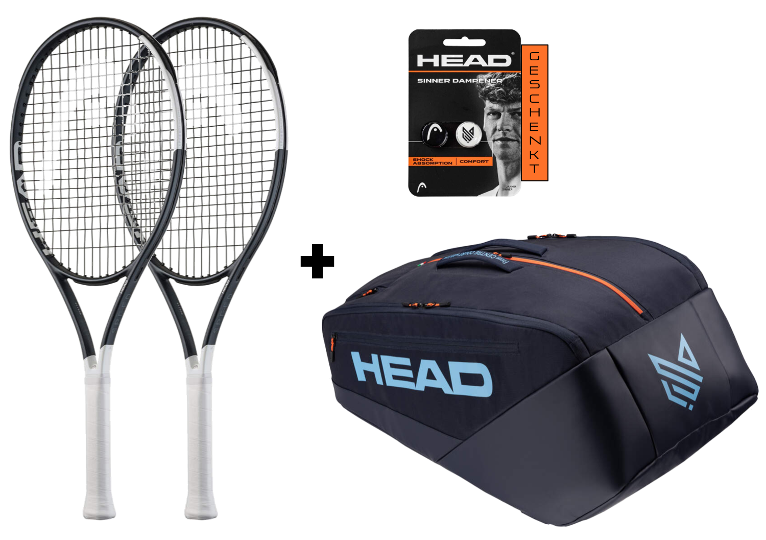 Bundle bestehend aus zwei Speed MP 2026 Tennisschlägern, einer Tasche (wahlweise "HEAD Pro Racquet Bag XL NV oder HEAD Pro Racquet Bag L NV") und einem "HEAD Sinner Dampener 2er Pack" als Geschenk beim Kauf eines Speed Bundles!